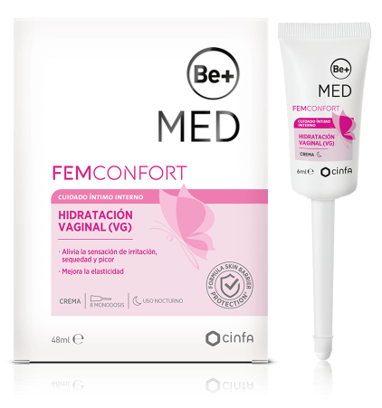 Be+ MED FEMCONFORT Hidratación Vaginal (VG) es un producto de cuidado personal especialmente indicado para combatir los síntomas de la sequedad vaginal postparto, periodos menstruales o inicio de la menopausia. Ayuda a mantener el pH fisiológico. El 91% de las mujeres perciben mejora de los síntomas de sequedad vaginal, irritación, ardor y picor. No es un medicamento. Estudios bajo control dermatológico y ginecológico.